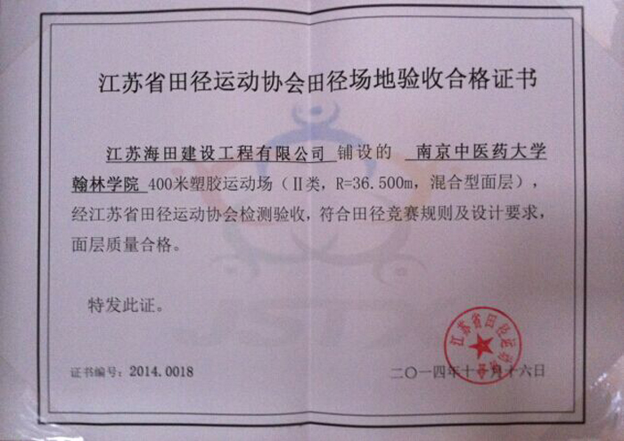 熱烈祝賀我公司承建的翰林學(xué)院400米塑膠運(yùn)動場被評為“江蘇省合格田徑場地(Ⅱ)”